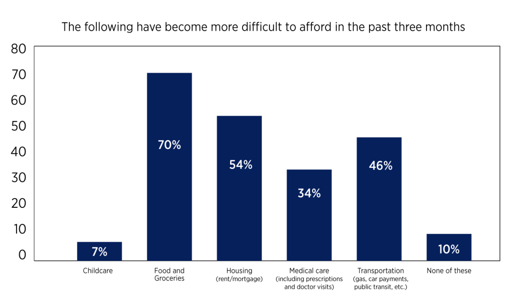 A large part of the picture of economic strain is from groceries: 70% say food and groceries have become more difficult to afford in the past three months, up from 60% in the beginning of the year. Over half also say housing has become more challenging this quarter.