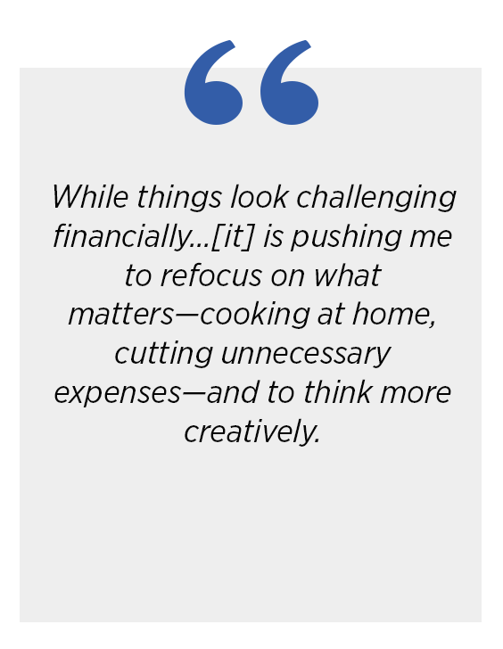 Less than a third of respondents say they feel confident in their ability to handle a major unexpected expense such as a large medical bill (29%). This finding fits within the broader context of 80% saying they consider themselves or their families to be living paycheck to paycheck, up eight points from this time last year. Of those working, 87% feel like their income is not keeping up with the rising cost of living.