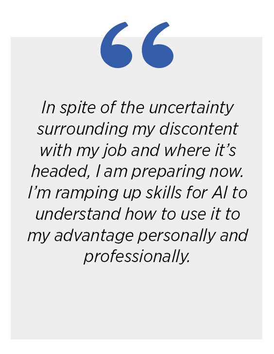 Respondents are split on how they perceive AI affecting their jobs over the next year: 48% say they are somewhat to very concerned, while 52% say they are not too concerned or not concerned at all. Currently, of those working, 60% say they are overall satisfied with their current employment. 80% of respondents are hopeful that their work/career will improve over the next year.